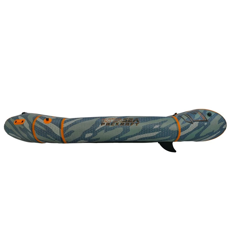 Hergestellt aus extrem strapazierfähigem und langlebigem TPU Material, bietet dieses Packraft nicht nur Funktionalität, sondern auch eine außergewöhnliche Optik. Das Camouflage-Design und die farblich abgesetzten Nähte machen es zu einem echten Blickfang.
